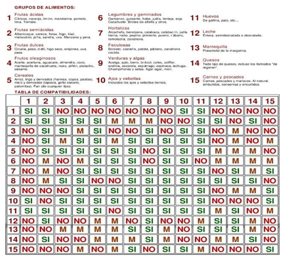 Para tener claro qué alimentos se pueden comer juntos y cuales no, se ha elaborado una tabla que hay que tener de referencia a la hora de combinar nuestras comidas, de forma que uniendo el alimento que hemos elegido de la parte lateral con el que quieres de la parte superior de la tabla, te lleva a un punto intermedio en el que aparecerá un Sí, si es buenos juntarlos, o un No cuando es preferible no unirlos.